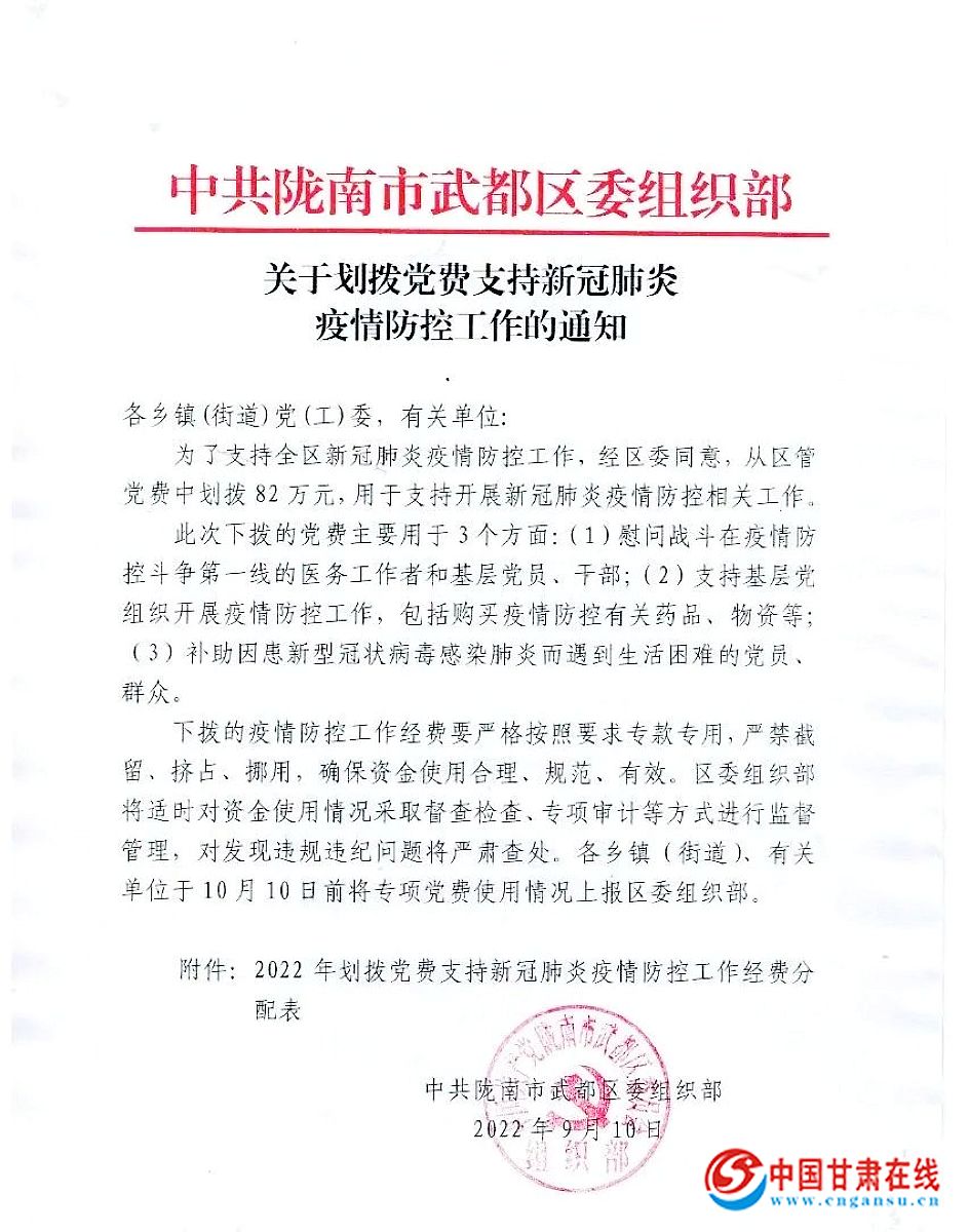 • [陇南]陇南市武都区:下拨82万元党费支持疫情防控工作