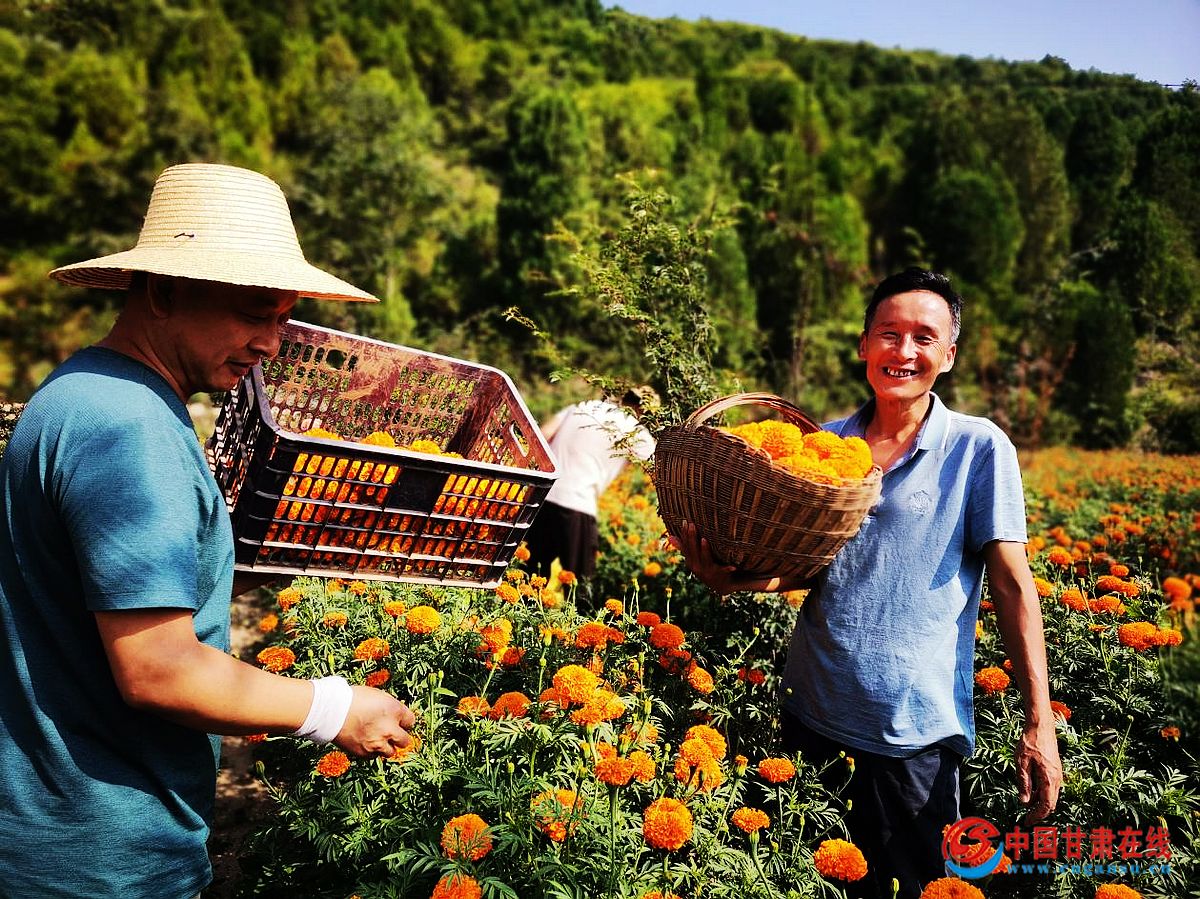 中国甘肃在线成县讯(通讯员 刘建军 王飞鹏)炎炎夏日,走进成县鸡峰镇,悠悠青山被条条金色的万寿菊花海环绕,为巍峨的鸡峰山增添了些许娇柔。田野里,一群群采花人在花间忙碌,喜笑颜开,一幅人勤村美的画卷展正徐徐打开……鸡峰镇坪庄村群众采摘盛开