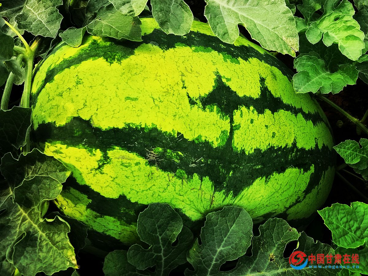 中国甘肃在线徽县讯(通讯员 马育江) 眼下正是西瓜成熟的季节。近日,笔者来到永宁镇泰伯村西瓜种植基地时看到,成片的西瓜长势喜人,郁郁葱葱的茎叶满地蔓延,一个个西瓜正披着翠绿色的外衣“卧”在地上,个头均匀、表面分布着脉络清晰的花纹,酝酿着一场