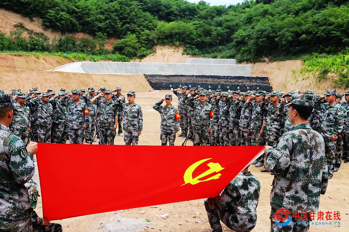 中国甘肃在线西和讯 “我志愿加入中国共产党,拥护党的纲领,遵守党的章程,履行党员义务,执行党的决定,严守党的纪律……”7月1日下午,西和县轮训备勤基干民兵在陇南市民兵训练基地火热训练场上,在鲜红的党旗前,上校政治委员尹政凯带领机关现役官兵、