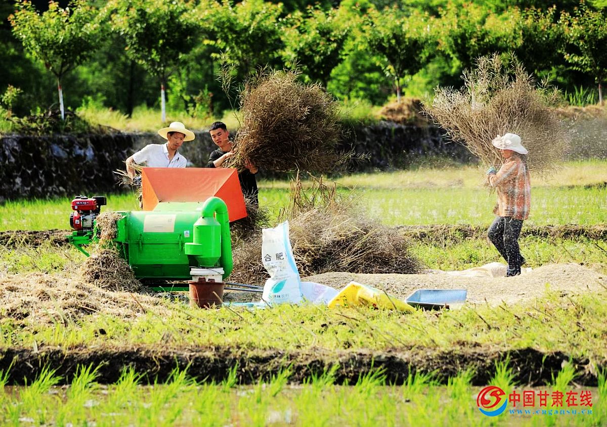 中国甘肃在线康县讯 农家少闲月,六月人倍忙。日前,康县2万亩油菜已进入成熟期,只见成片油菜籽挂满枝头,颗颗饱满。趁着晴好天气,大南峪镇花庙村的村民抢抓农时开镰收割,田间地头一派繁忙的丰收景象。 大南峪镇发展油菜种植2000亩,去年10月种植
