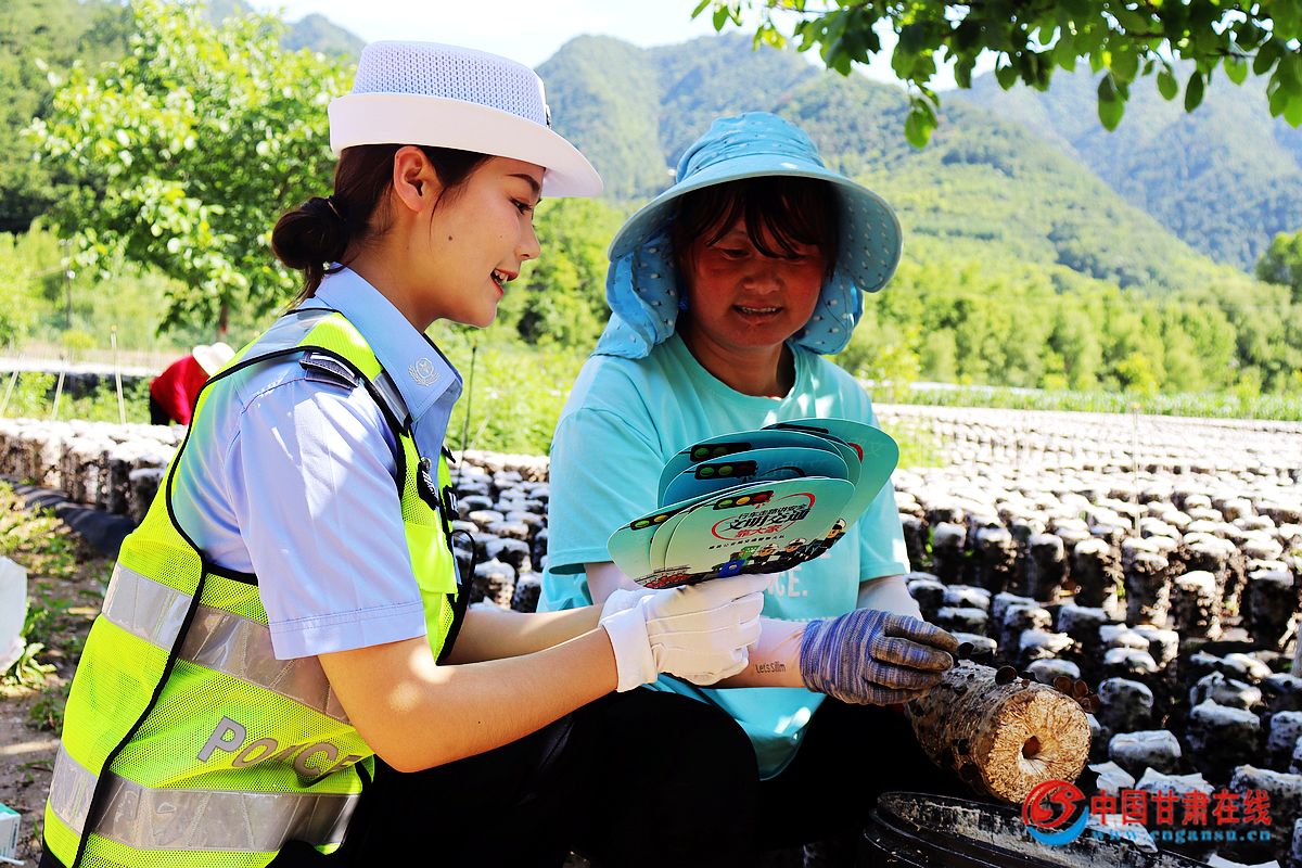中国甘肃在线康县讯 6月14日,康县公安局交警大队结合“一盔一带”安全守护行动,以发放交通安全知识读本、印制有“文明出行、从我做起”字样的宣传品扇子,通过拉家常的的方式,积极组织宣传民警前往康县景盛种植农民专业合作社开展进城务工人员宣讲活动