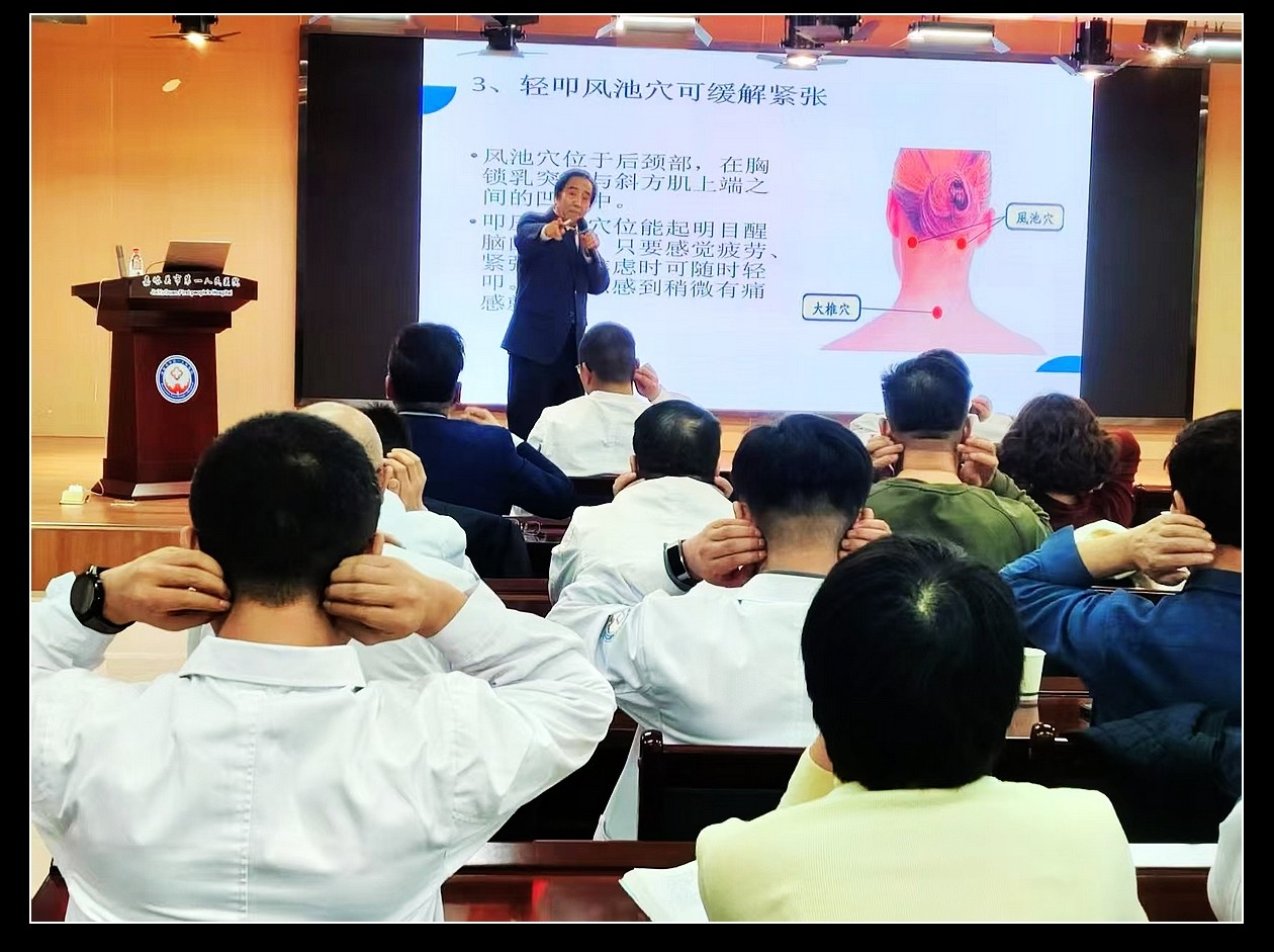 莫会长通过中医心理学为健康中国服务理念,结合中国传统文化和中医养生保健知识,现场示范和传授了自我心理调适与压力管理的实用技巧,并现场示范了简易压力缓解训练,获得参与者广泛共鸣。