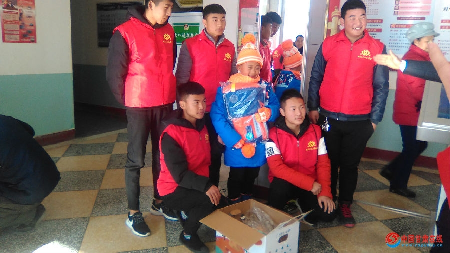 现场的工作人员、志愿者们同孩子及家长一起拆开温暖包,并为孩子们穿上温暖包里面的新羽绒服,戴上手套、围巾,背上新书包。