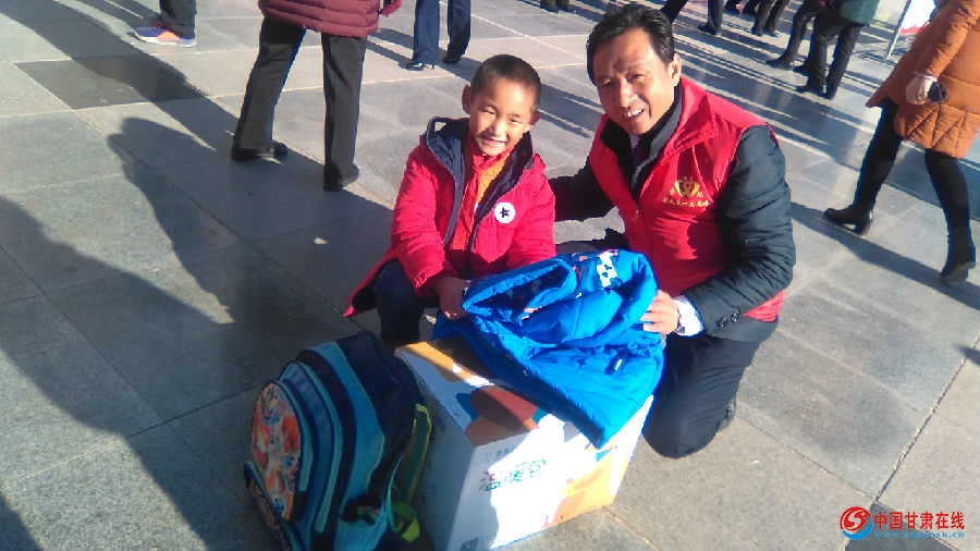 蔺世琦——金塔县航天爱心志愿者协会会长与何光富合影。何光富小朋友开心地对记者说道:“非常感谢叔叔阿姨送来的新衣服、新围巾,这些东西让我感觉很温暖。我一定会要好好学习,等长大后才能去帮助其他人。供稿 裴学爱