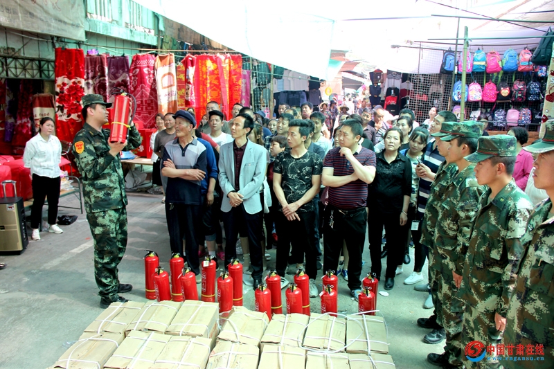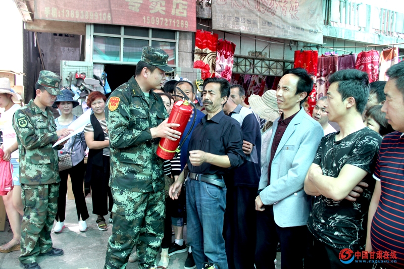“使用前,先检查灭火器压力是否正常,压力正常时将灭火器上下颠倒几次,然后把下保险销,站在火焰上风方向3米至5米处,左手握住喷嘴,将喷嘴对准火焰根部,右手用力压下压把……”,这是武山大队官兵为个体户讲解灭火器使用方法的一幕。近日,武山消防大队联合洛门镇政府为辖区成衣市场200余家个体工商户配备灭火器,为全面打赢夏季火灾防控工作奠定坚实的基础。(张小龙)