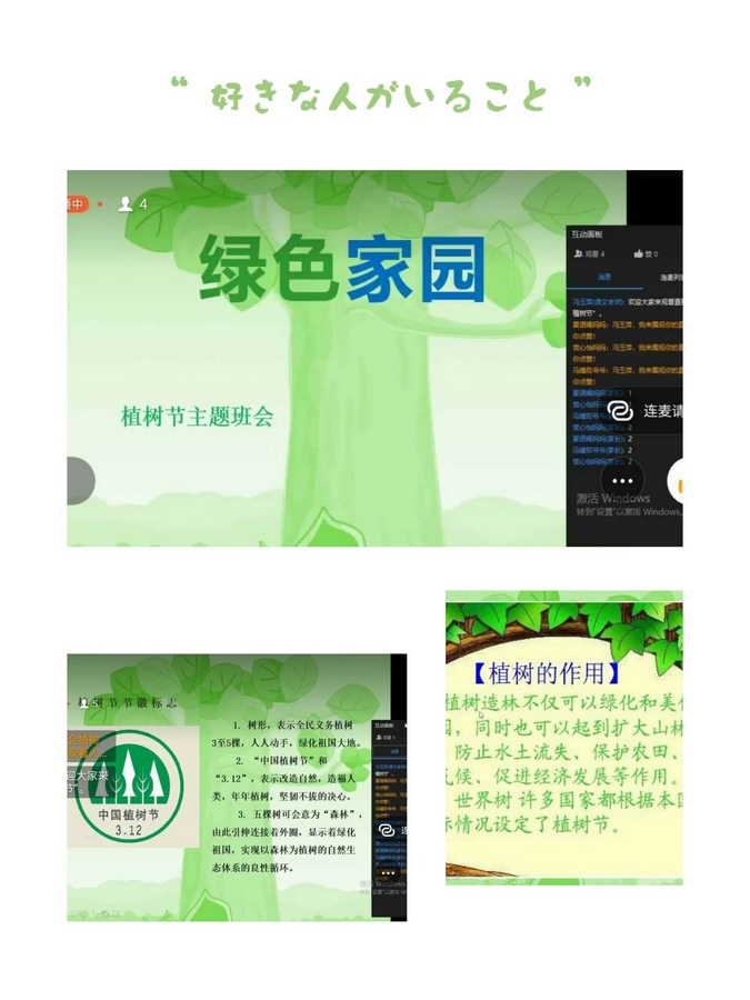 各班班主任在线开展班会课,在班会上同学们不仅了解了植树节的由来及意义,还深刻地认识到植树与环保的关系。班主任们不仅给学生们现场演示如何培育绿色植物,而且提倡大家进行环保创意手工小制作,争当环保小志愿者。