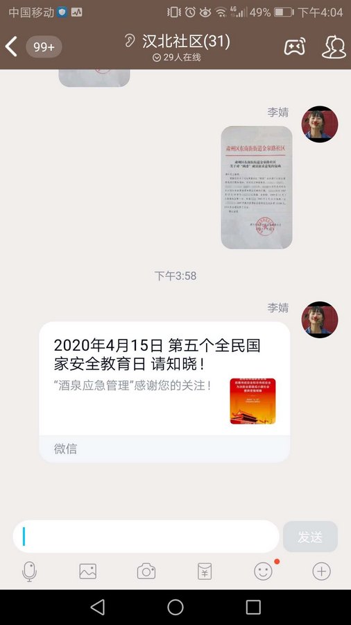 社区工作者在辖区楼院小区通过悬挂宣传条幅,利用电子屏滚动播放宣传标语,发放《国家安全法》《反恐怖主义法》《网络安全法》《禁毒知识》等国家安全教育宣传资料100余份,利用qq、微信等网络媒体向广大居民、过往人员、商户群众宣传国家安全的法律法规知识。居民群众表示,国是家的国,家是国的家,国家安全人人有责,在今后的工作生活中,一定会认真学法、守法、尊法、用法,同时积极参与普法宣传活动,以实际行动维护国家安全利益。