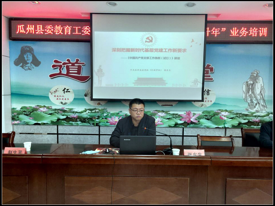 培训伊始,县委教育工委分管领导赵生平主任做了培训前讲话并对本年度党建工作做了安排和要求:2020年教育工委各基层党组织要围绕全面落实新时代党的建设总要求和新时代党的组织路线,以深化拓展“基层党建质量提升年”活动为主线,以推进党支部建设标准化工作为抓手,以“四抓两整治”为主要措施,持续补短板、强弱项、抓治理,不断增强各基层校园党组织政治功能和组织力。培训会上,李晓伟主任、张东生副校长分别围绕2020年基层党建重点任务和《中国共产党党支部工作条例》进行了深入的解读培训,县教育局杨明做了“对标落实,全面提升党建质量;立德树人,党建业务融合推进”专题辅导。下午,全体参训人员分别深入县一中第四党支部、渊泉小学党支部、渊泉第三小学党支部和渊泉第三幼儿园党支部进行了实地观摩培训学习。