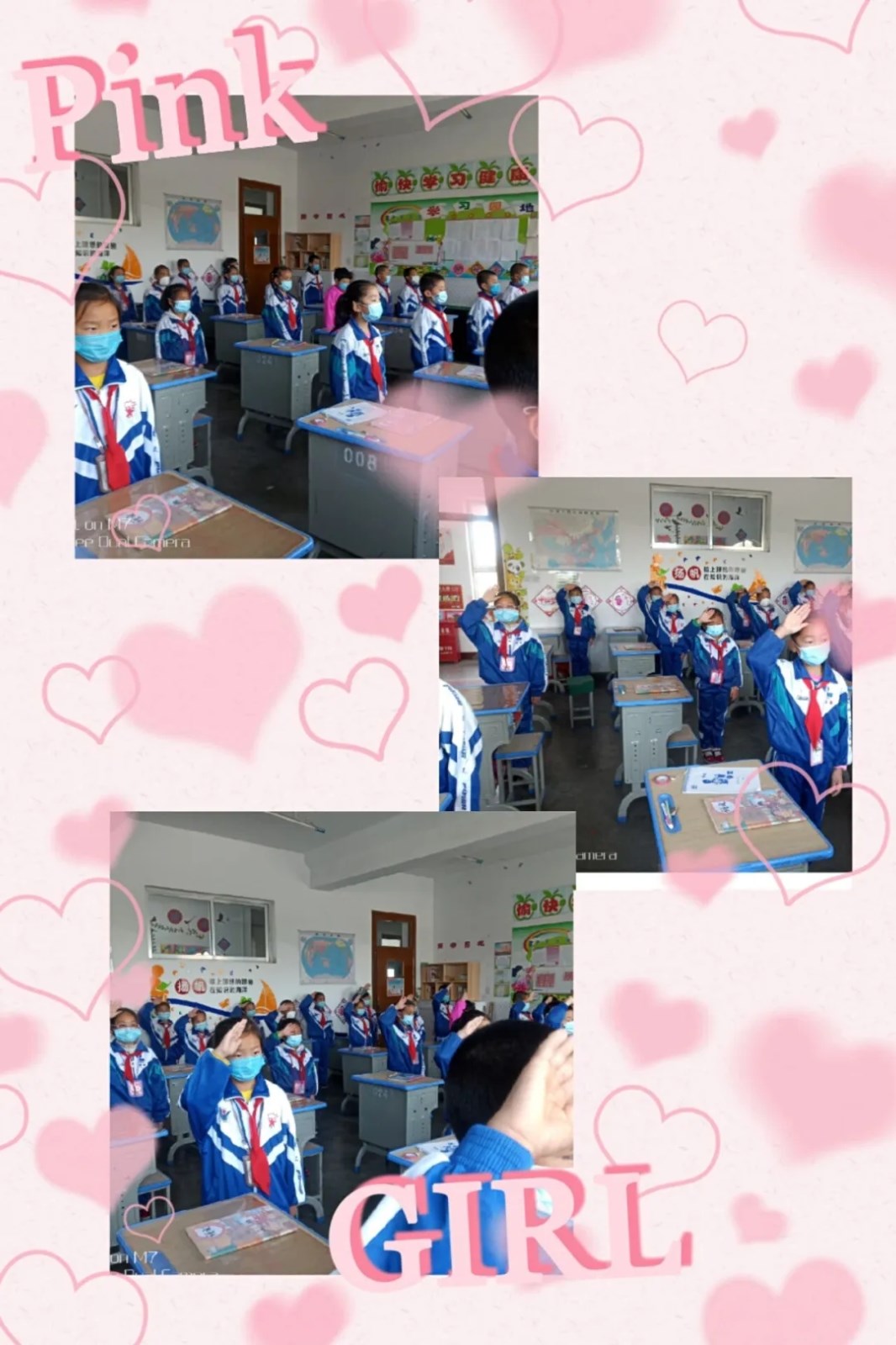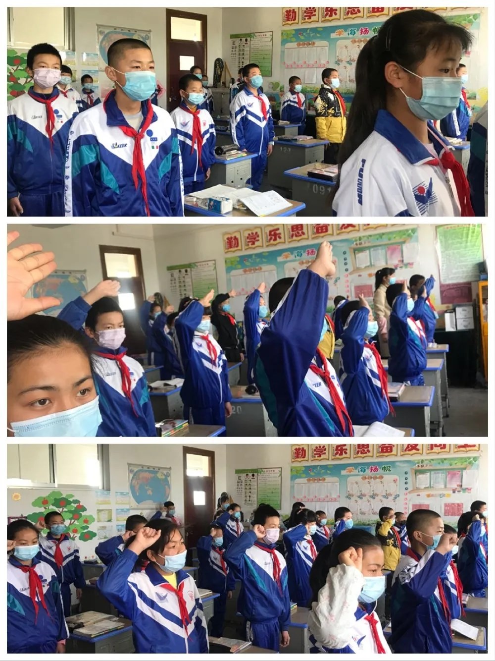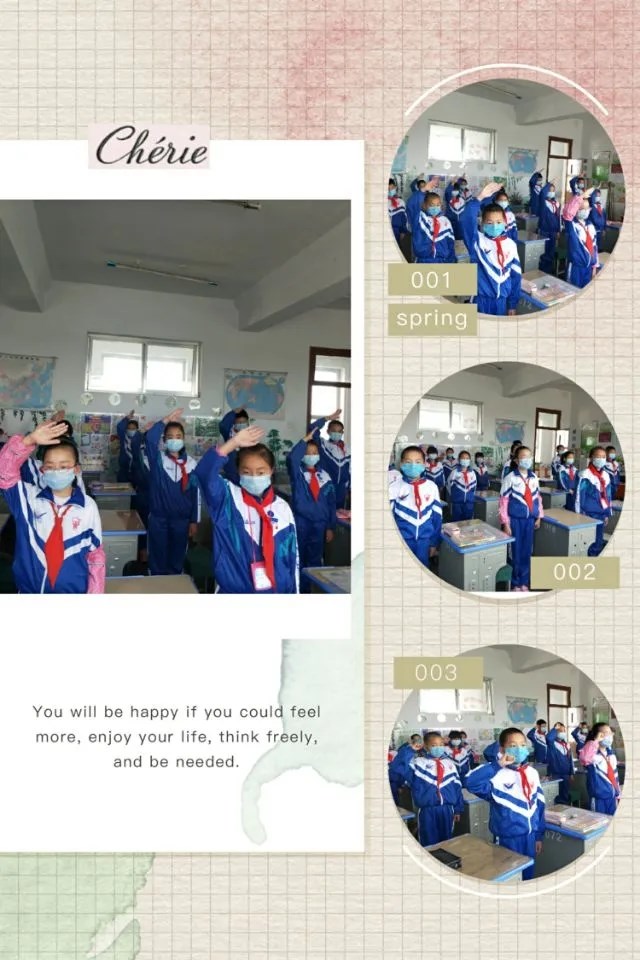 升国旗活动在室内进行,学生们身着校服,佩戴口罩、佩戴红领巾面向国旗,立正敬礼,高唱国歌。标准的敬礼、炯炯的眼神、坚毅的表情、响亮的呼号,无不表达着身为中国人的自豪,无不表达着:让我们携起手来,共同努力,一起打开新学期的画轴,描绘新的斑斓和希望的信心与决心。