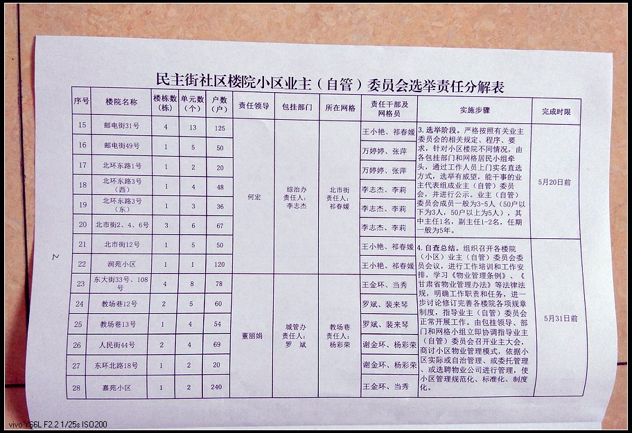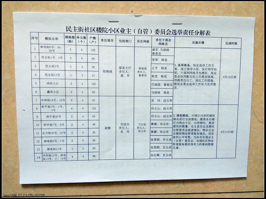 为了维护老旧楼院改造后的崭新成果,发挥小区业主的主人翁意识,进一步强化网格化管理力量,在社区领导班子的精心研判下,制定了科学的强化业委会建设工作思路,及时召开社区网格化管理暨业委会改选培训会,会上,分管领导讲解了业主委员会改选的流程和注意事项以及网格化管理的工作要求,依据物业管理服务提升工作要求,依法依规地完成好楼院(小区)业主委员会的换届选举工作任务,进行了再动员,再部署,印发了《民主街社区楼院小区业主(自管)委员会选举任务分解表》和《网格化管理资料汇编》,充分利用网格化管理优势,实行领导划片包干、部门包网格、社区干部和网格员包楼栋的方式开展业委会选举和改选工作,进一步明确了具体任务和工作时限,靠实了工作责任。