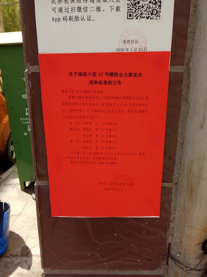 社区对选举产生的业委会成员在小区内进行为期7天的张榜公示,接受居民的监督及建议。在公示无异议后,工作人员将督促业委会成员填报业主委员会成立备案表,为社区规范小区楼院自治管理奠定良好基础。