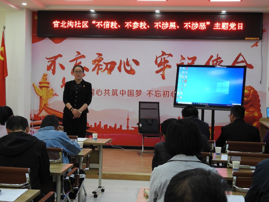 为进一步坚定理想信念,增强党性观念,严明共产党员不得信仰宗教的政治纪律和政治规矩,永葆共产党员的先进性和纯洁性。5月12日下午,官北沟社区党总支联合共建单位市林草局、市林果中心、市公共资源交易中心,在居雅苑新时代文明实践站开展了“不信教、不参教、不涉黑、不涉恶”主题党日活动。