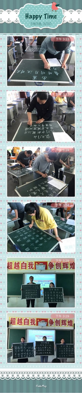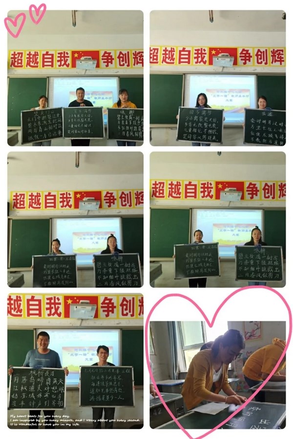 首先举行的粉笔字比赛,书写内容为一首七言绝句,参赛者在规定的六首古诗中抽取书写内容,规定在十分钟之内完成书写。比赛现场个个劲头十足,信心百倍,在属于自己的那块小黑板上,精心设计,尽情挥毫。