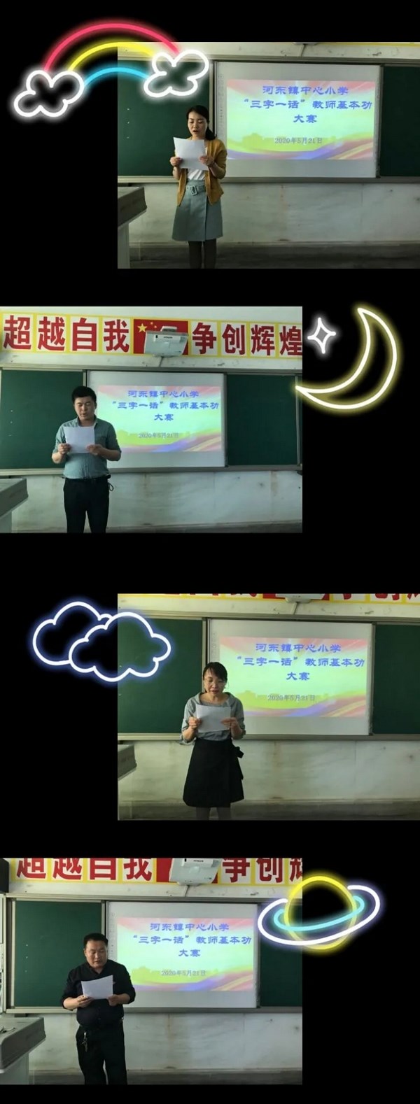 第三项进行的是普通话比赛。采取现场抽签、现场展示的 办法进行。参赛选手任意抽取由教导处提前准备的朗读内容,每人两分钟的准备时间,有现场其余教师当场打分。