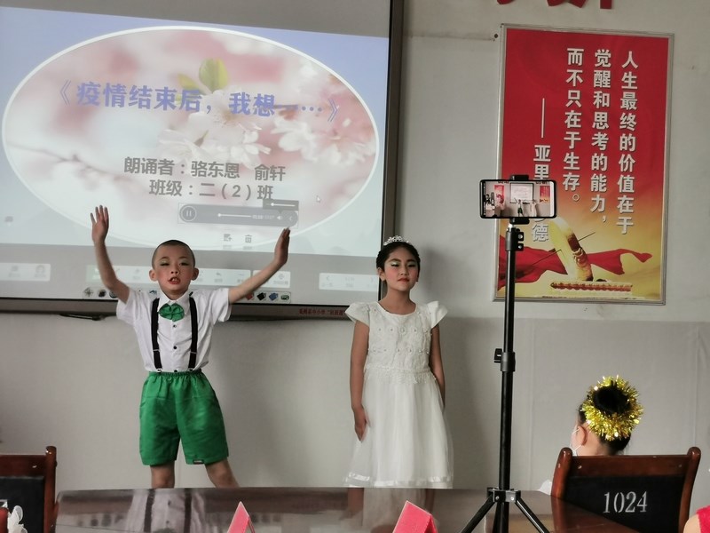 气势豪迈,感情气定山河的一首《战疫情·致敬英雄》是一年级两位小朋友的朗诵篇目,她们激情饱满的朗诵表达了对医护人员、国家栋梁、逆行英雄们的崇高的敬佩之情,稚嫩的声音感动评委老师潸然泪下,台上台下感情交融,声瑟和鸣。二年级同学朗诵的《疫情过后,我想……》主题感人肺腑,表演精彩绝伦,他们用自己稚嫩的身体语言告诉我们:所有人心中共同的期盼就是这场突如其来的疫情赶紧结束,我们会做没有怪兽病毒的美梦,看樱花、放风筝、爬高山、爬长城、做高铁、看升旗仪式……句句透露着中国在我们少先队员心中的伟岸、强大,抒发了孩子们的爱国情怀。
