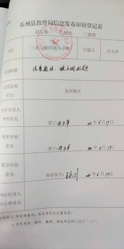 普通话散发着醉人的芬芳,普通话蕴含着情感的激流,6月17日,三道沟镇四道沟小学开展了“说普通话,做文明好学生”演讲比赛。