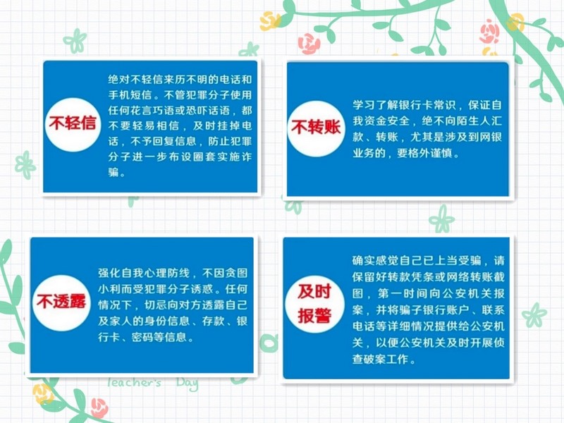 在宣传中告知居民如遇到疑似诈骗电话时要谨记“三不一及时”:不轻信、不透露、不转账、及时报案。