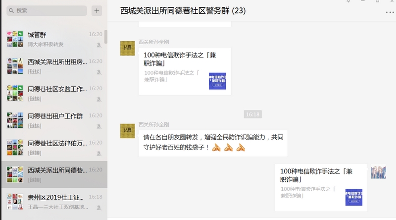 同时,社区创新宣传载体模式,积极运用“e信通”平台、居民微信群等新媒体开展多层次、全方位的宣传活动,全面揭露电信诈骗犯罪手段,普及防范常识,提高广大居民群众的防骗意识和识骗能力。