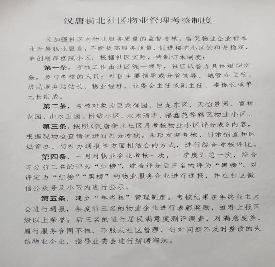 健全考核机制,明确目标任务。根据辖区8个物业小区的不同情况,社区领导们多次斟酌、研究,制定了《物业考核制度》、《物业小区考核评分表》,并召开了由物业公司、业委会、单元长参加的物业服务质量提升年推进会,将考核制度、评分标准下发各物业公司、业委会,明确物业服务考核的目标任务,在服务过程中抓主抓重。