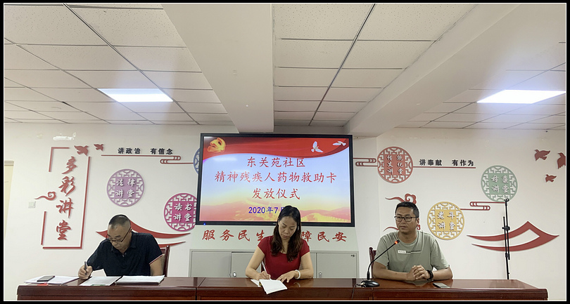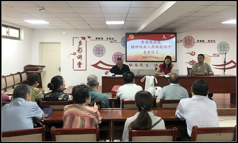为进一步做好精神病防治康复工作,切实解决贫困精神病患者的治疗与康复困难,7月3日下午,东关苑社区举行贫困精神残疾人服药救助卡发放仪式,社区副主任李明霞、精神残疾人亲属共20余人参加仪式。