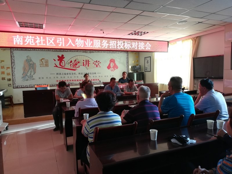 2020年7月10日下午19点,在南苑社区会议室召开了第一次关于南苑社区引入物业服务招投标对接会。与会的人员有社区分管领导、网格工作人员、2家竞标物业企业负责人和管理人员,以及一标段以南苑苑中园小区为主的8个小区楼院业委会和居民代表共计30余人,共同探讨未来物业进驻小区后物业的服务、收费、管理等问题。
