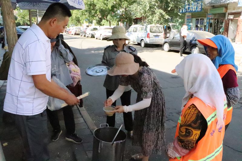 为营造全社会关心、关爱城市环卫工的良好氛围,7月28日下午,酒泉市肃州区同德巷社区园林路菜店老板王隆英,为辖区清扫员购买糯小米10斤,绿豆10斤,冰糖10斤,将亲手煮好的绿豆冰糖粥,在社区副主任董莉、城管办人员和网格人员的陪同下,走街串巷,亲自送给坚守在高温一线的21名环卫工手上,并向他们表示关心和问候!