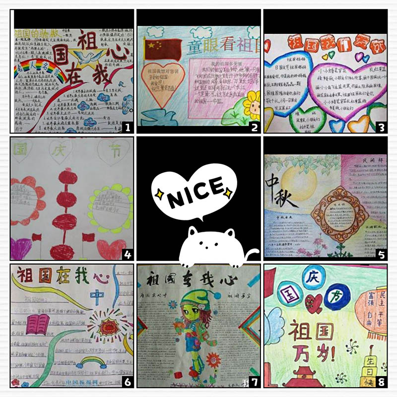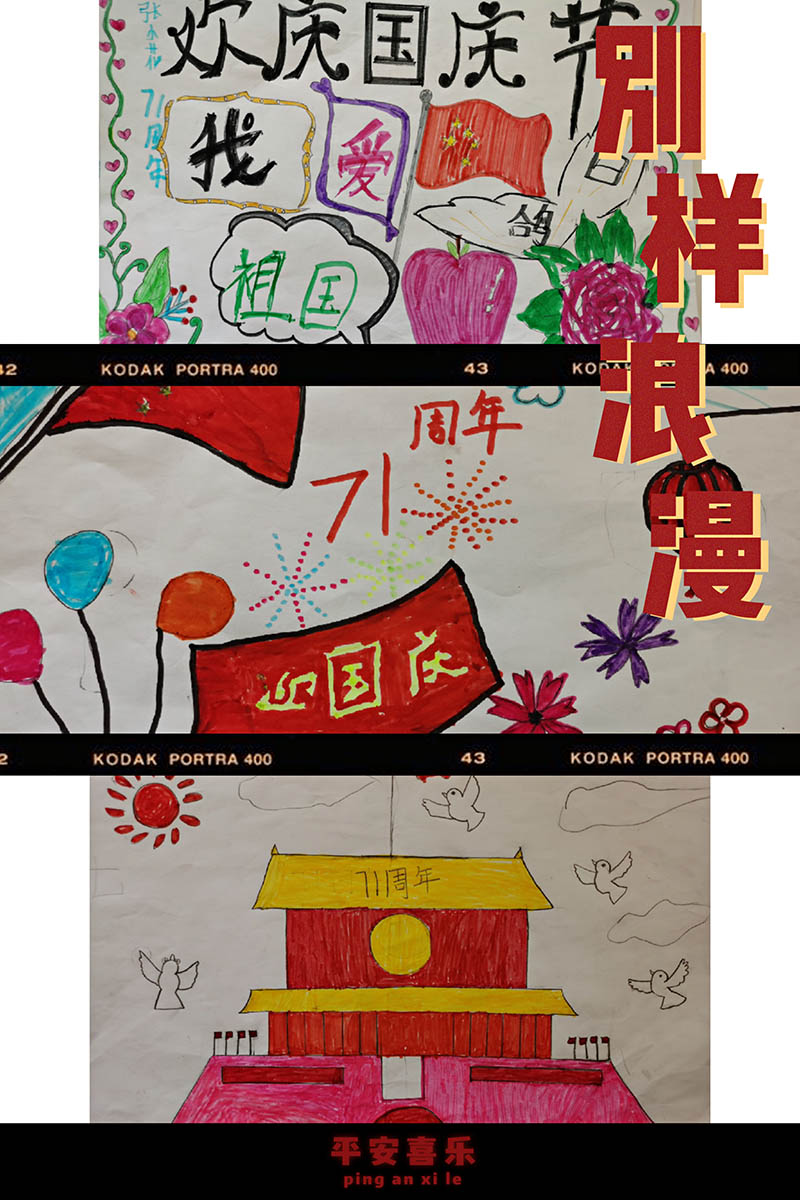 六、为了让孩子们国庆长假过得更有意义,学校安排综合实践作业:一是1-2年级学生和父母画国旗学唱过国歌。二是3年级通过假期的游玩写一篇赞美祖国大好河山游记,或描写以经济发展国家富强繁荣的变化为主的作文。三是学生认真完成各学科及安全作业。