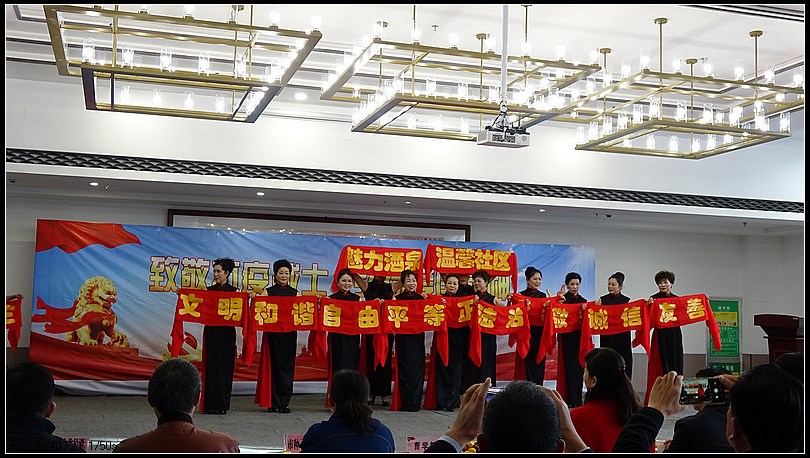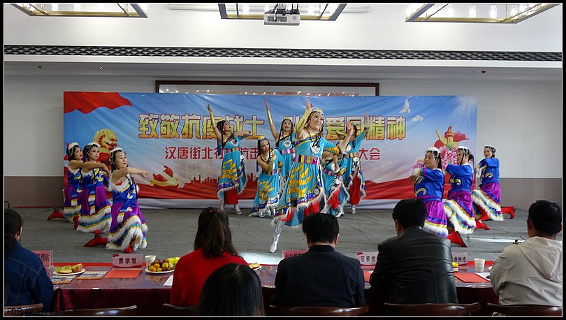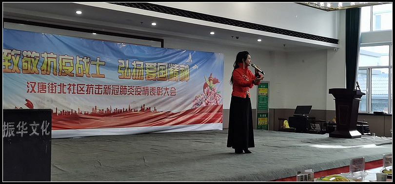 表彰大会上,首先对奋战在疫情防控第一线、表现突出的先进典型予以表彰,授予地矿宝圆物业公司山水玉园项目部等10个集体“汉唐街北社区抗击新冠肺炎疫情先进集体”称号,授予张瑜等70名同志“汉唐街北社区抗击新冠肺炎疫情先进个人”称号。以“致敬抗疫英雄 弘扬爱国精神”为主题的长扇舞《山海情深》、诗朗诵《你的样子》、非洲鼓《旗开得胜》、男声独唱《等待》、豫剧《谁说女子不如男》等节目精彩上演,呈现了一场美轮美奂的视听盛宴,展现了抗疫工作者“迎难而上、甘于奉献、大爱无疆”的职业精神,分享的抗疫故事诠释了社区工作者默默无闻、毫无怨言地坚守岗位、积极劝返、入户排查、宣传引导的职责内涵,赢得现场观众阵阵掌声,最后,大会在挥动的小红旗、大合唱《我和我的祖国》中落下帷幕。