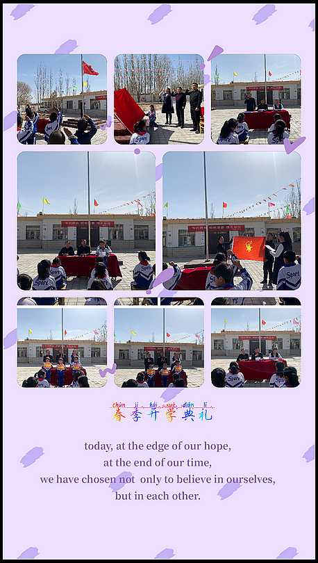 寒雪梅中尽,春风柳上归。清晨的白雪闪着温柔的光,映着一张张孩子们的笑脸。伴随着欢乐的歌声,老师和学生整齐的站在广场上,庄严的升旗仪式拉开了开学典礼的帷幕。