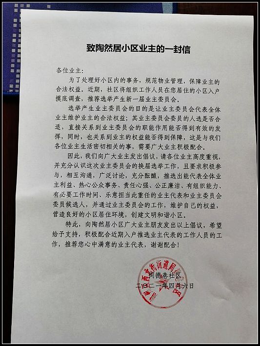 多措并举打前站,营造氛围。为使推选工作的顺利开展,前期社区采取干部包楼栋、包户形式,由社区工作人员通过走访、电话征求意见、张贴公告、发放《致陶然居居民的一份信》、在业主微信群等方式广泛向业主进行宣传,营造氛围,为下一步选举工作打基础、做准备,使小区业主及时了解、知晓,为有效有序推进业主委员会选举工作,提高居民的知晓率打下良好的工作基础。