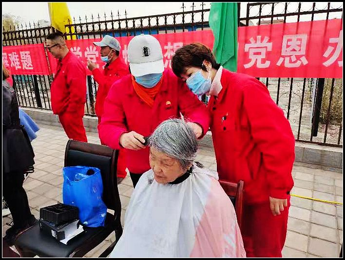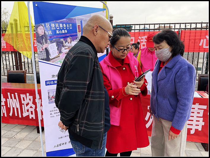 在活动现场,社区志愿者们正在为居民开展新冠疫苗预约接种进行扫码登记,养老、就业、法制宣传,新城医院的医生正在进行健康咨询,测量血压,等便民项目。看,不远处,玉门宝石花物业公司的志愿者们为居民免费理发、磨刀,居民也不自觉得排起了长队。同时,油田公安分局的民警志愿者们正在向居民宣传防范电信诈骗等......