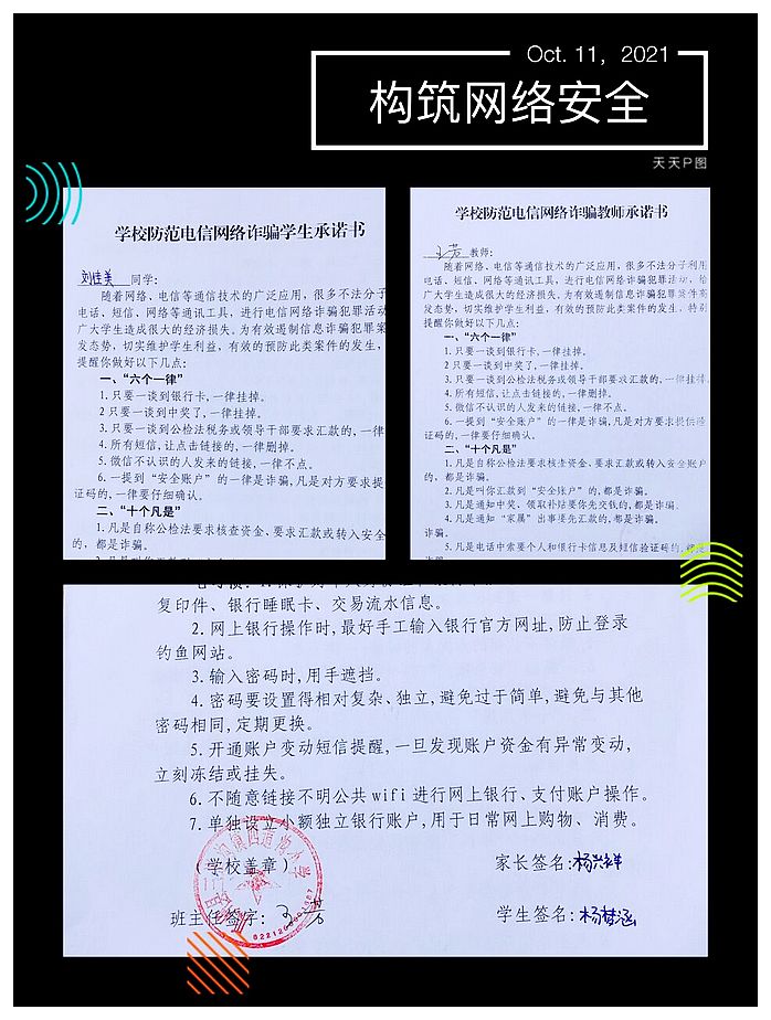 本次活动的主要内容为:一是集中组织开展专题教育,包括课堂教学、主题班会、板报、知识讲座、演讲比赛等。二是学校分别与教师签订《四道沟小学防范电信网络诈骗教师承诺书》、与学生家长共同签订《四道沟小学防范电信网络诈骗学生承诺书》,并向每位学生发放《致中小学生家长的一封信》。三是各班通过家访、借助传播媒体微信等方式向家长广泛宣传网络安全知识,严格规范学校日常管理,推动家长履行监护职责,使安全发展理念深入人心。