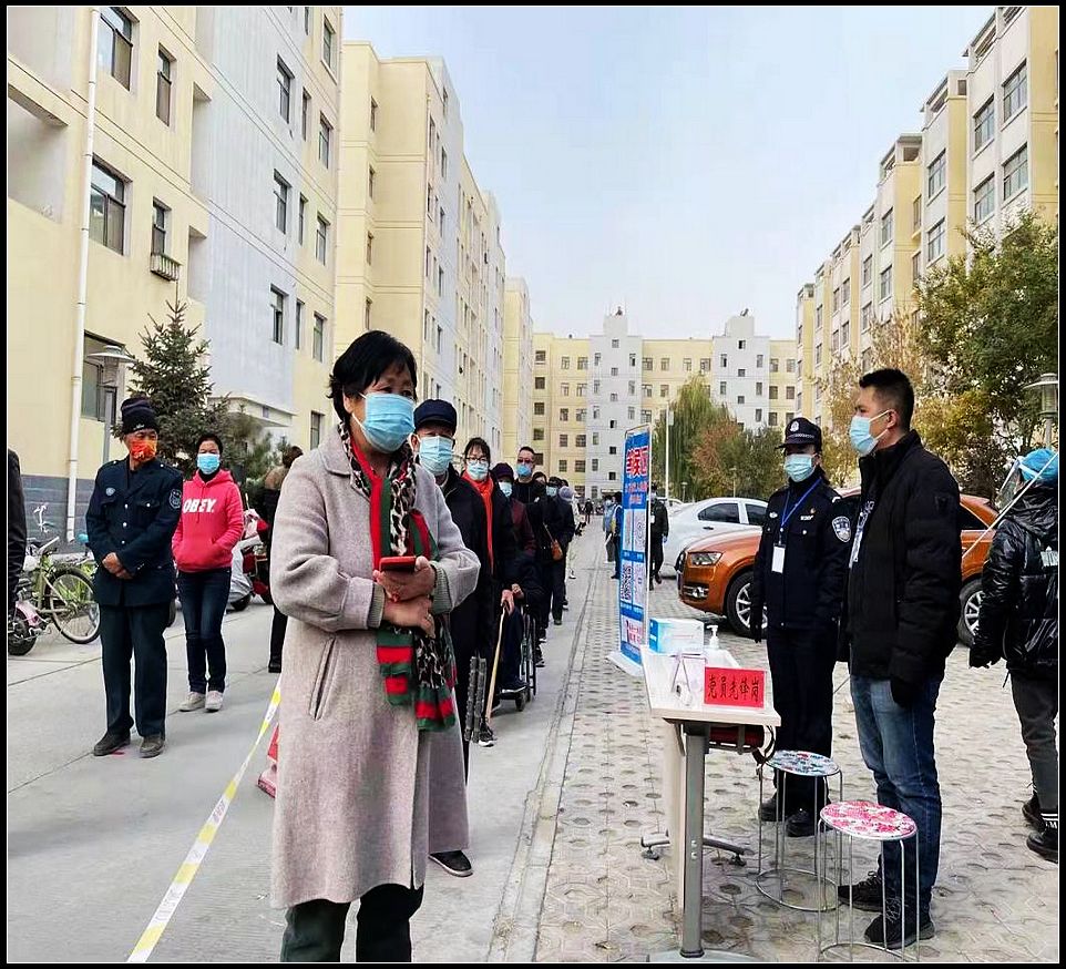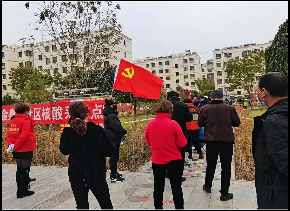 “有党旗在的地方,就会让人感到心安!” 正在飞天苑核酸检测采样点排队采样的居民李女士说到。