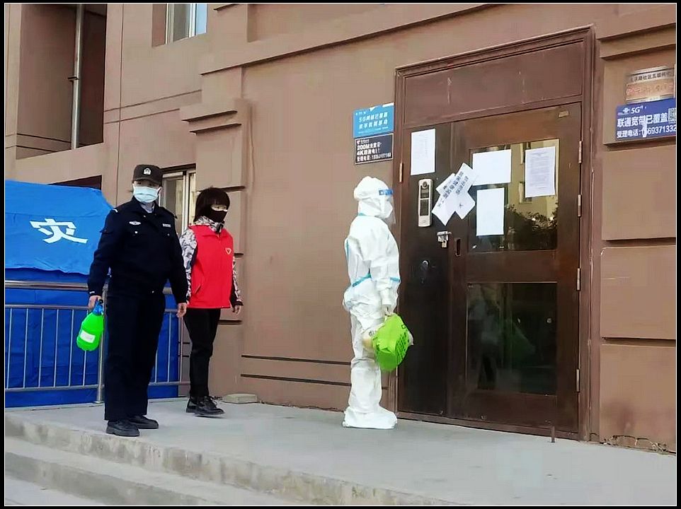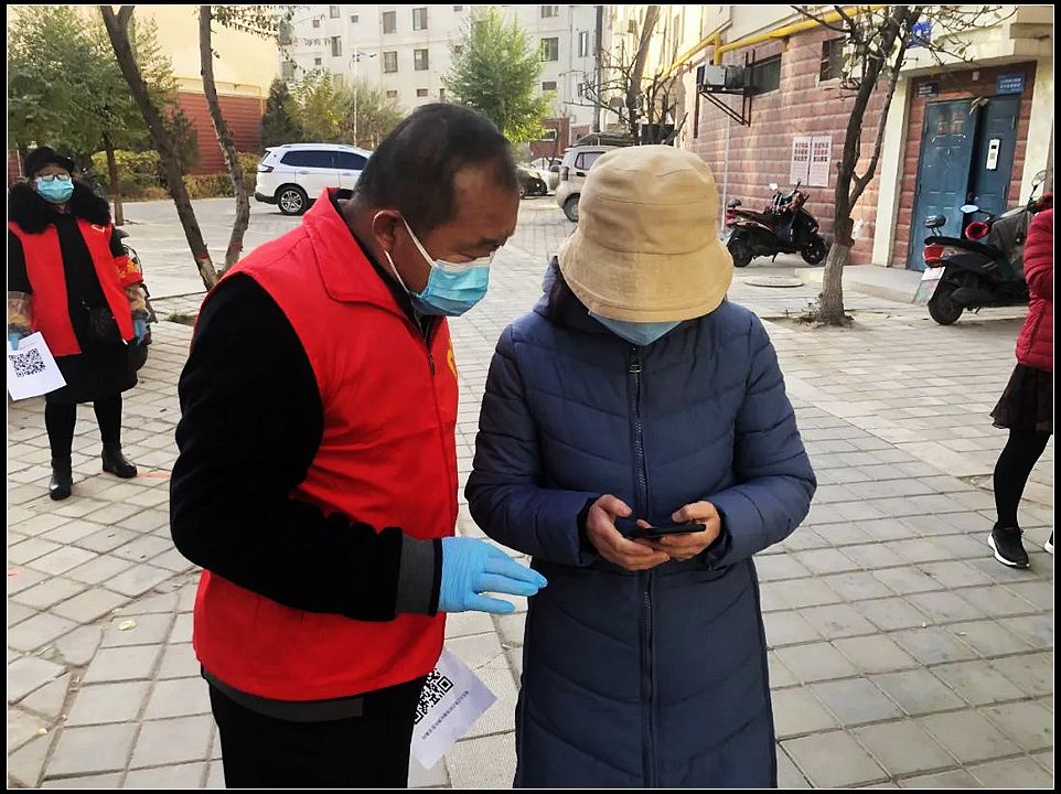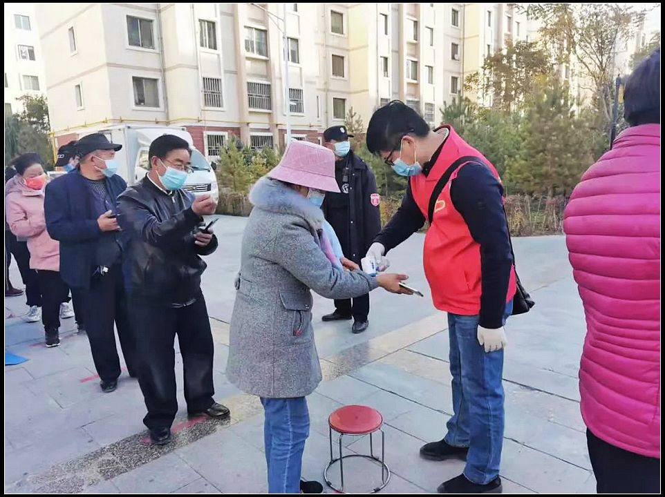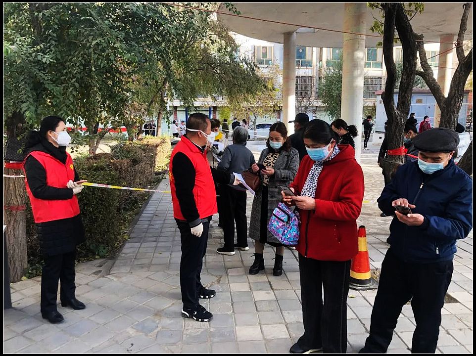 “请大家排好队,保持一米以上安全距离,请提前准备好您的健康码、身份证......”南苑社区第三网格检测点下沉干部酒泉市文体广电和旅游局的王海宇、史兰华和盛雪娟,正穿梭在排队人群中,维持疏导秩序、测量体温、引导居民扫描健康码,组织人员有序离场,核酸检测现场秩序井然、顺畅高效。