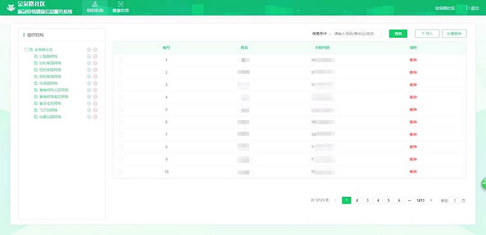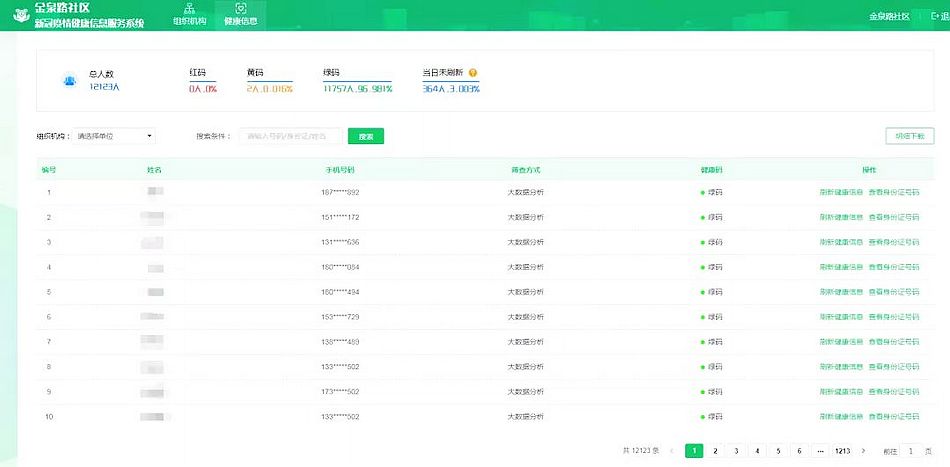 “信息化技术+科学化统计”,疫情防控“智能更便捷”。社区积极对接电信公司,激活使用新冠疫情健康信息服务系统,系统包括组织机构和健康信息两大功能模块,通过后台监控、定时更新、信息跟踪等,数据在后台自动进行统计和查询,工作人员可随时查看辖区居民的健康码情况。通过运用高效的信息采集和统计手段,实现了疫情防控“横向到边、纵向到底”的信息统计要求,为社区开展全员核酸检测工作及疫情防控工作提供了全面的数据支撑,使人员排查更高效。