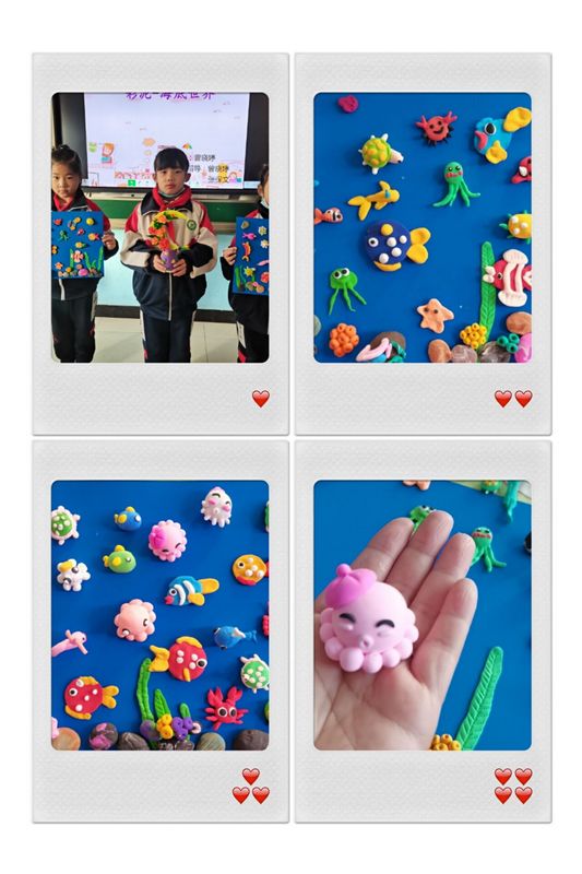 一双双灵巧的小手捏着粘土,调色、造型、组合、装饰……不一会儿,一只只可爱的小章鱼就展现在大家面前。看着自己的“杰作”,孩子们更加兴奋了。不同类型的小鱼,珊瑚,贝壳,水草,一块块石头……孩子们将自己的作品一一展示出来,形成了一道靓丽的风景线。