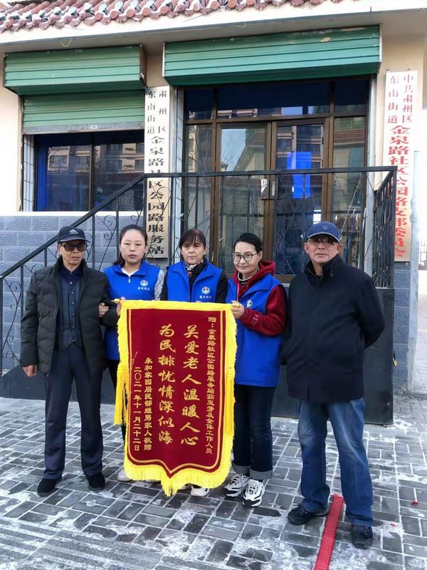 11月23日上午,金泉路社区1969片区网格服务站里,传来阵阵笑声。永和家园居民郜师傅将写有“关爱老人温暖人心,为民排忧情深似海 ”的锦旗送到了网格长茹玉芳手中,对网格工作人员表示感谢。