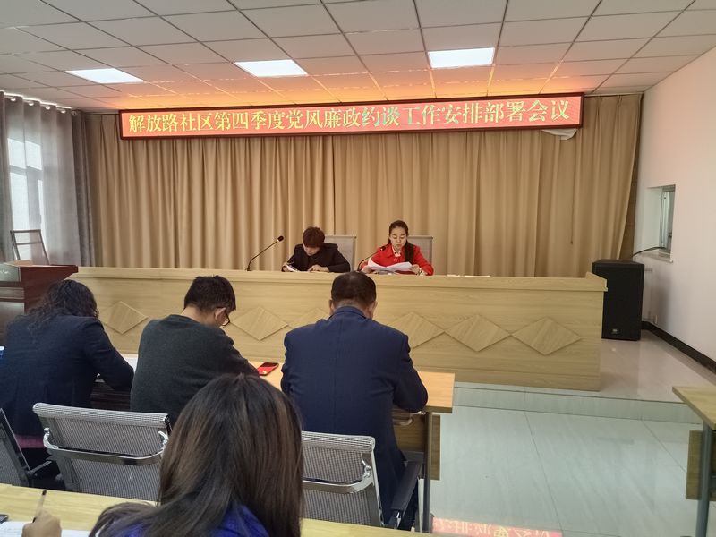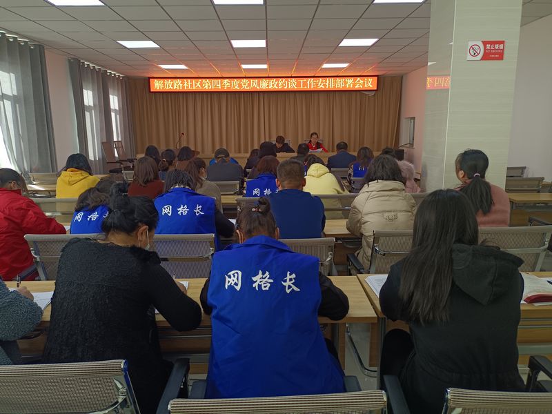为深入贯彻全面从严治党战略部署,严格落实党风廉政建设主体责任和监督责任,结合社区冬季集体教育工作内容,进一步增强社区党员干部履职尽责意识,12月6日,东南街街道解放路社区召开2021年第四季度党风廉政约谈工作安排部署会议。