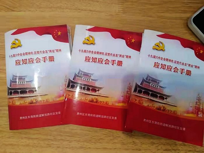 “大爷,打扰您一下,这是我们社区制作的十九届六中全会精神宣传册,您拿一个去看看呗。”