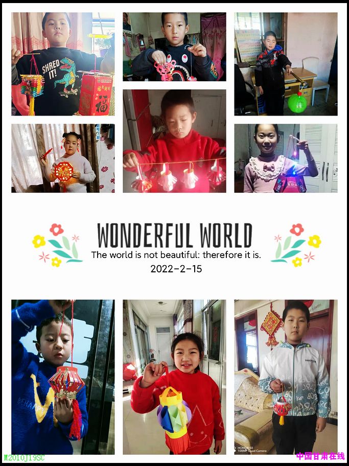 为了欢庆元宵,培养孩子们的动手实践能力,孩子们和父母一块在家就地取材,变废为宝,利用旧红包纸、彩纸、空瓶子等意想不到的材料制作成一个个漂亮的环保花灯。同学们做的花灯极富想象力,各具特色,创意无限,充分体现他们巧妙的构思与极强的动手能力。既享受了制作的乐趣,又亲身体验到中华民族文化的魅力。瞧,一个个心意满满象征着团圆、幸福的灯笼出炉啦!