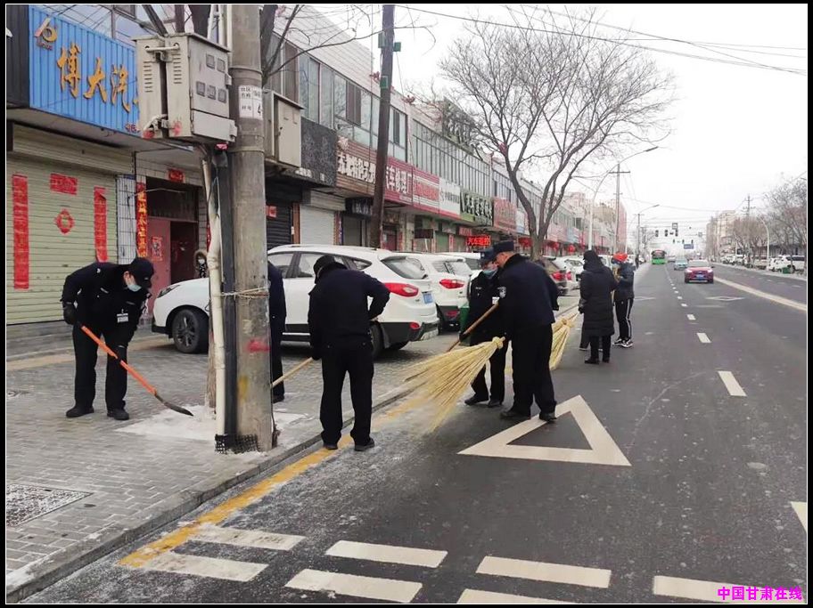 中国甘肃在线酒泉讯 为巩固春节前卫生清理工作成果,确保辖区环境卫生干净整洁、市容市貌井然有序,2月18日,按照城管委“清污消土”常态化和“一周一主题”的工作要求,东北街街道同德巷社区联合片区长、各责任单位、物业公司、网格长、城管志愿者等开展了铲冰扫雪“清视觉整治”行动,努力实现节后环境卫生新气象、新面貌。