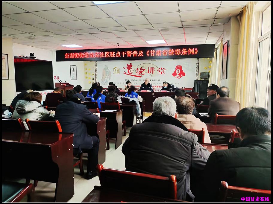 南苑派出所所长讲解普及《甘肃省禁毒条例》,对涉及的社区职责内容进行有重点的培训,针对条例中第二章宣传教育展开重点讲解,普及识毒、防毒知识、禁毒法律法规,提高居民识毒、防毒和拒毒意识,进一步细化了社区层面在甄别制毒、防毒及宣传方面能够运用的措施手段,教育引导居民崇尚健康美好生活,自觉抵制毒品。