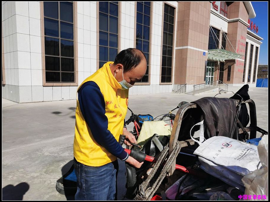 中国甘肃在线玉门讯 2月25日,于大爷开三轮车途中前轮破裂,正在一筹莫展时,玉门市新市区街道迎宾路社区党员志愿者伸出援助之手,帮他及时将坏轮胎补好,还帮忙换上了修好的轮胎。
