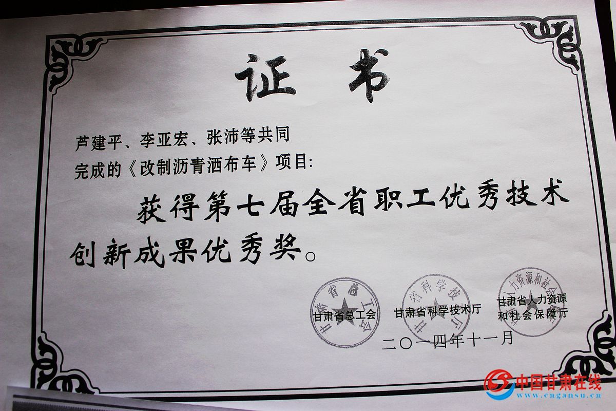 最终,铁木机修班通过改变加温炉的方位、增大烟道直径,以及增加储备烟尘箱体等举措,改制研发成功了具备加温快、效果良好,且燃煤降低三分之一的新式沥青加温罐。同年,改制的沥青加温罐被甘肃省交通运输厅和甘肃省科学技术厅联合授予“科研杯”全省交通运输职工五小发明成果二等奖,2014年研发改制的“改制沥青洒布车”被甘肃省总工会、甘肃省科学技术厅、甘肃省人力资源和社会保障厅联合授予第七届全省职工优秀技术创新成果优秀奖,2018年铁木机修班更是被甘肃省总工会授予“甘肃省创新型班组”荣誉称号。