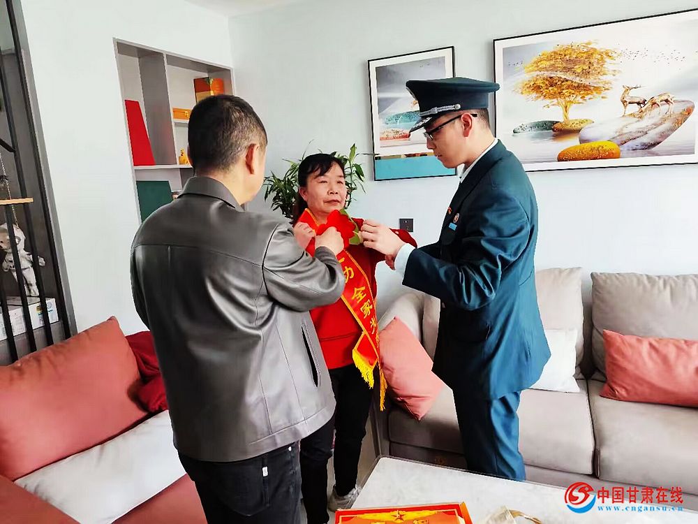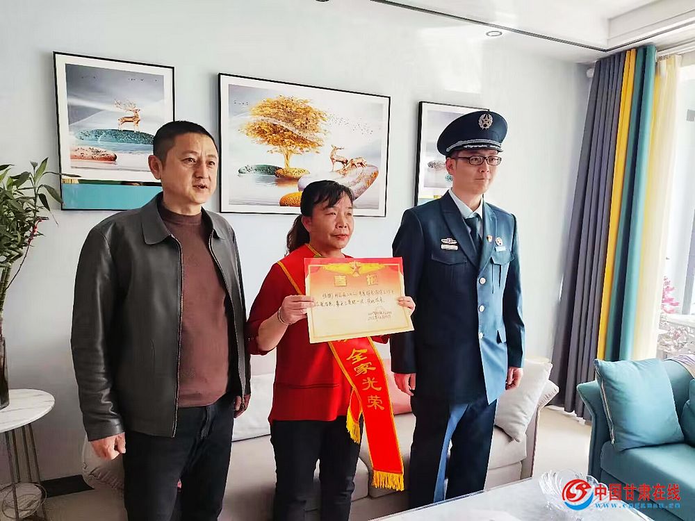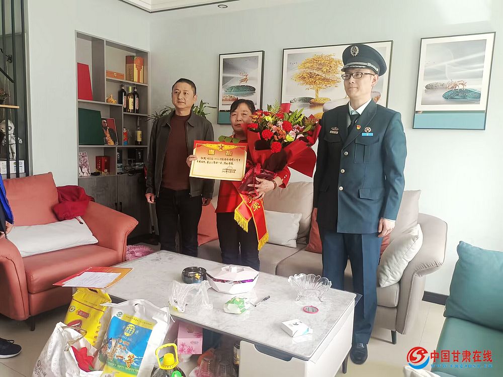 中国甘肃在线肃州讯 为弘扬拥军优属、拥军爱民的光荣传统,努力提升军人尊崇感和荣誉感。4月12日,肃州区退役军人事务局、区武装部领导、东北街街道北新街社区、辖区网格长来到北新街社区常青碧水绿洲小区,为荣立三等功的现役军人张衡家庭送上立功喜报、鲜花以及慰问礼品,表达党和政府对立功军人家属的关怀和问候。