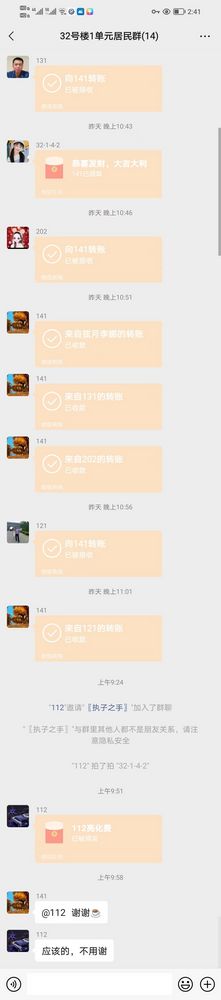 网格长黄艳琴平时与居民都有联系,每户都有微信,立即建立了1单元临时群。同时与在该单元居住的世博花苑楼院党支部党员兼楼长商定,此次楼道亮化费由其负责收齐。群里居民一呼百应,纷纷在群里发红包缴费注明门牌号。最后,楼长在群里收费、统计后,发到群里公示,在第一时间将收齐的费用共406元交给酒泉市楼道亮化服务工程中心,将缴费发票在群里公示。网格长随即跟踪催促亮化工程中心维修并通电,将楼道灯亮起来,大家非常高兴。