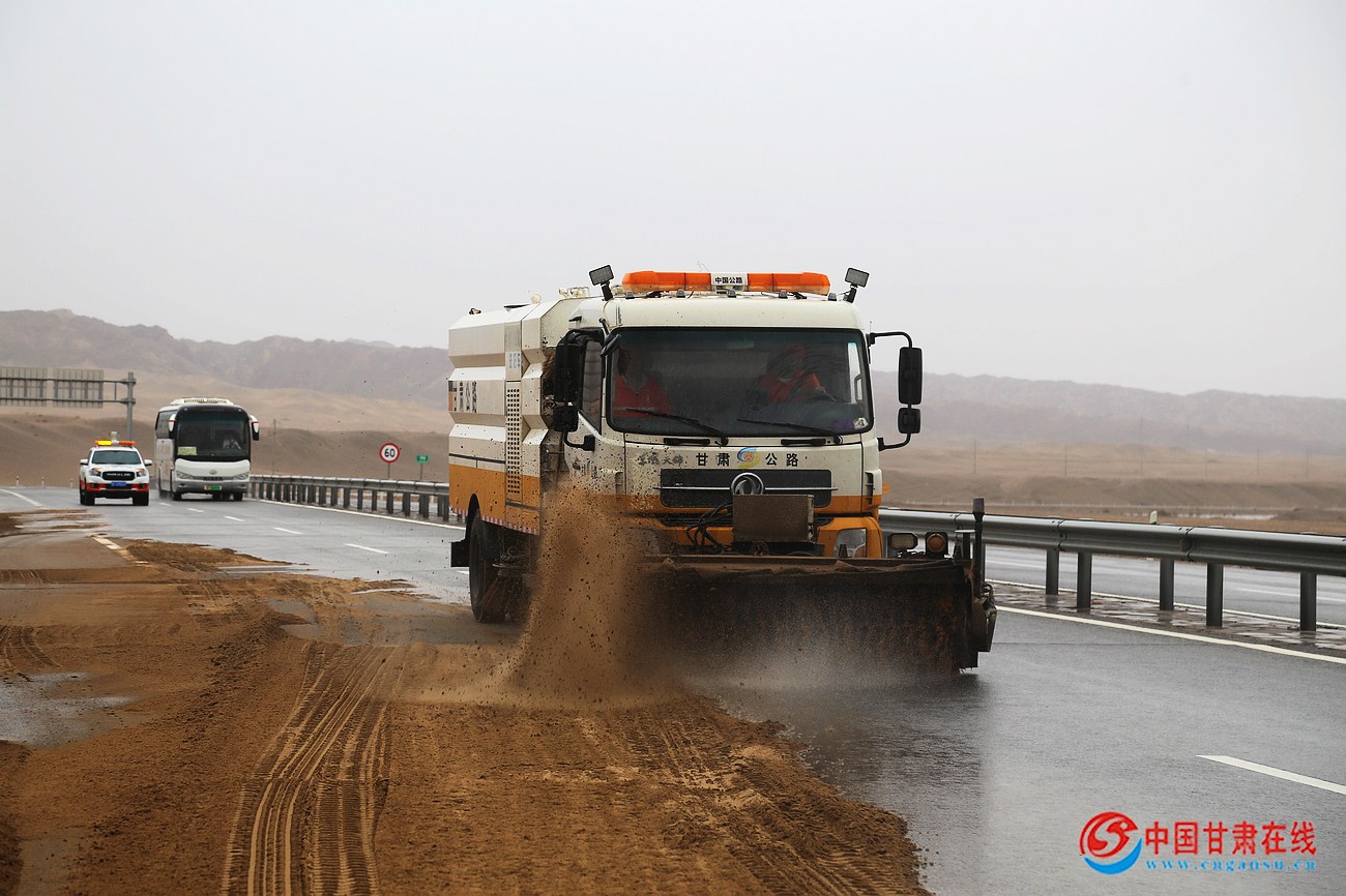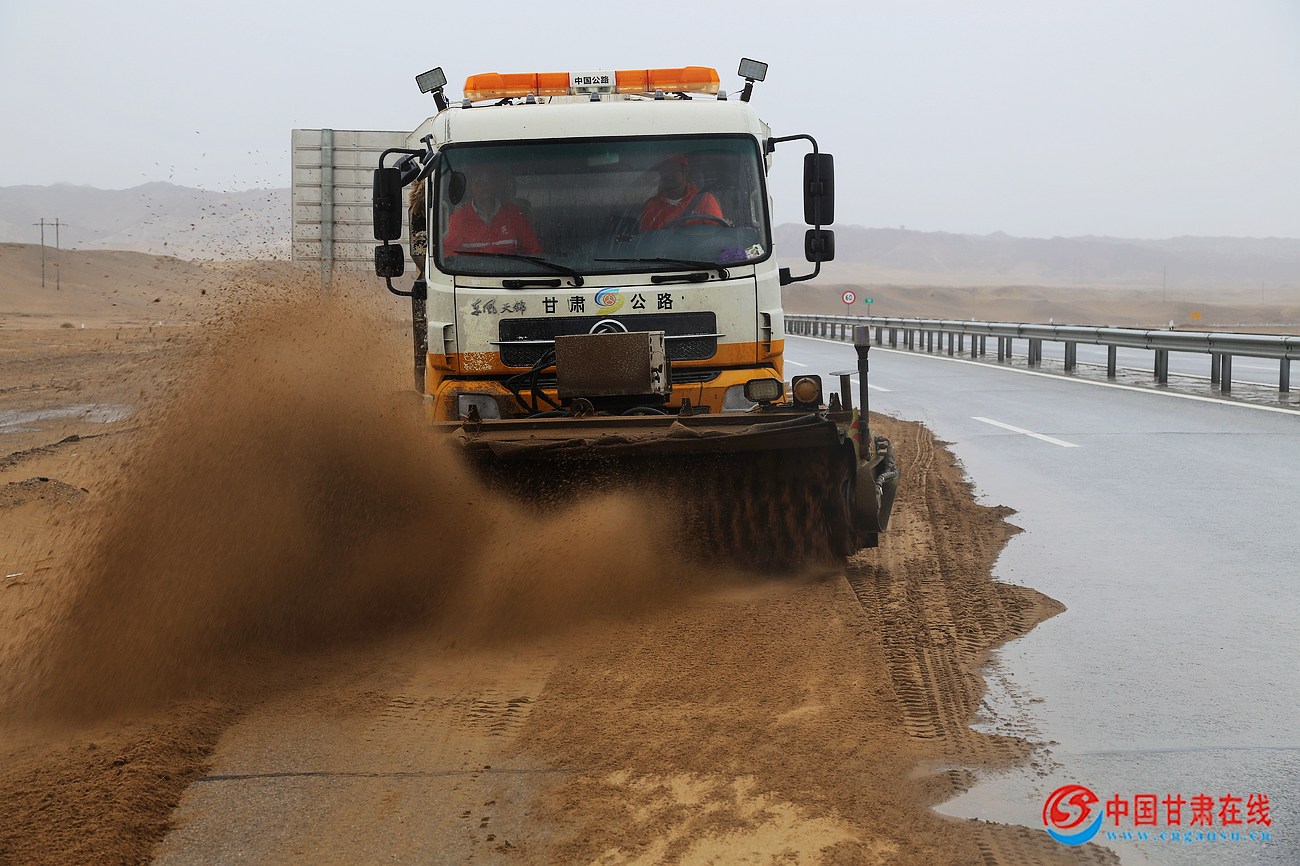 据现场技术员报告,此次大风沙尘降雨天气使的高速公路3011线和通往莫高窟的省道240线部分路段出现不同程度流沙上路淤积现象,严重路段淤沙一度达到3cm厚度,加之降雨天气影响给清淤沙工作带来了极大的困难,降雨和流沙混合使得清扫车清扫滚筒极易出现打滑和淤堵不能正常清扫情况,截止9月6日14时30分,该段道路淤沙清理工作已艰难完成,目前道路安全畅通。