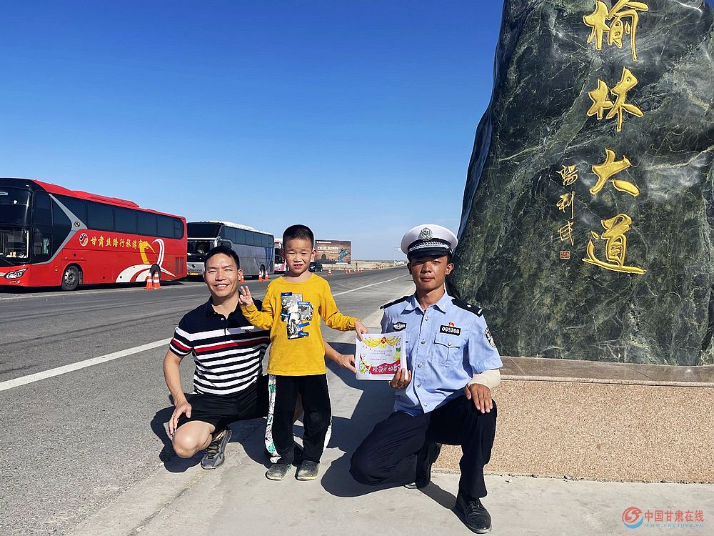 2023年8月1日,瓜州县公安局锁阳城派出所民警正在大地之子网红打卡点指挥交通,疏导车辆时,一对父子向执勤民警走来,小男孩踮着脚,双手举着一份精心绘制的“奖状”送到了正在执勤的民警手中,并开心的说:“警察叔叔,你们辛苦了”,同时,一旁的父亲对在烈日酷暑下,默默守护游客的平安的瓜州公安民警致以崇高的敬意。