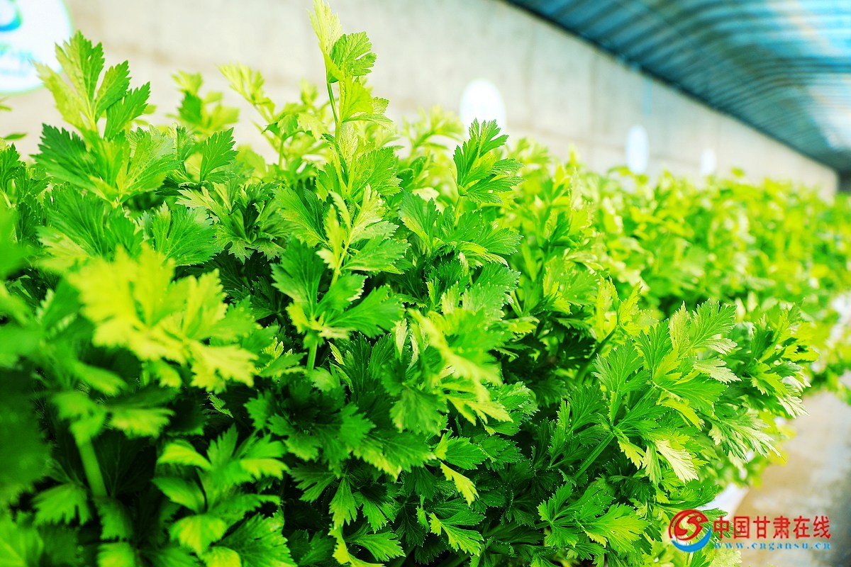 2023年12月1日,甘肃省酒泉市金塔县金塔镇沙漠生态农业园的日光温室大棚内,种植户正在采摘芹菜。